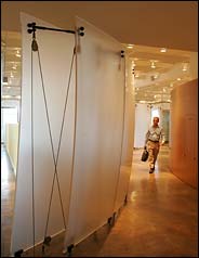 partitions, rise like austere hedgerows from caramel-tinted concrete floors,
