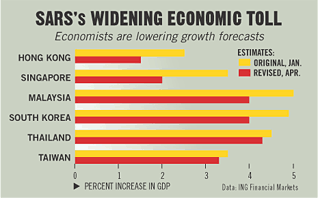 City-state Singapore slashed its economic growth rate by half, to no more than 2.5% this year, because of SARS. Malaysia may follow suit and Hong Kong says its growth may be "dampened" as Moody's Investors Service Inc. warned that the territory may lose its A3 credit rating.